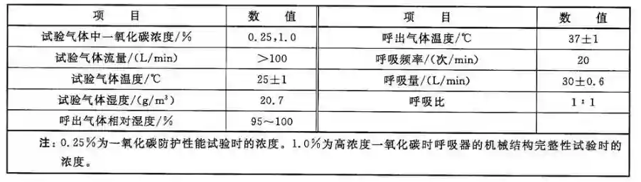 1、试验装置原理与标准GB 21976.7-2012图2一致,并满足下表的一氧化碳防护性能试验条件;